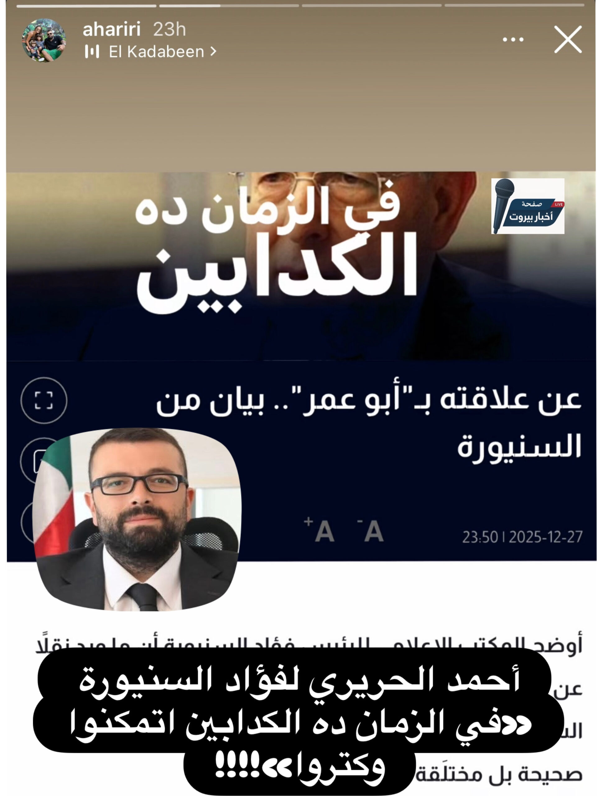 أحمد الحريري ينشر عبر «إنستغرام» بيان السنيورة الذي نفى فيه علاقته بـ «أبو عمر»، مصحوباً بكلمات أغنية:«في الزمان ده الكدابين اتمكنوا وكتروا»!!!!