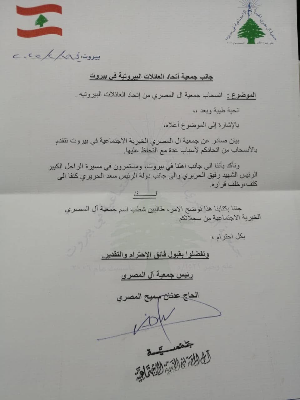 حيث أننا نؤيد هذا القرار وندعو باقي الجمعيات العائلية في بيروت للانسحاب من الاتحاد وتأسيس إتحاد جديد يرعى ويهتم بشوؤن بيروت وأهلها بكل إخلاص وشفافية وصدق